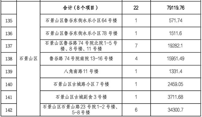 近日,北京市住房和城乡建设委员会公布了第四批中央企业北京旧城区综合改造项目名单。同时,材料完成后的前三批合格项目名单也予以公布。共有165个项目。第四批申报项目共160个,其中符合条件的项目142个。分布在全市东城、西城、朝阳、海淀、丰台、石景山六个区。共涉及建筑223栋,总建筑面积约66.7万平方米。我们先来看看石景山吧!共8个项目,22栋建筑,占地面积79119.76平方米!来看看其他区吧!萨前三批,公布了116个需要补充材料的项目。目前,符合条件的项目有23个并得到正式确认。看看邻居们在做什么? ■注:本文由家住石景山的小编整理发表,转载时请注明 ■来源:北京发表 据北京日报 ■本期法律顾问:北京恒略律师事务所,咨询微信:jwbei2 跟随家住石景山的小编,看石景山的大事小事,搜罗家附近的吃喝玩乐! ====== 石景山的邻居圈子! ====== 商务微信:Jiasupao2014