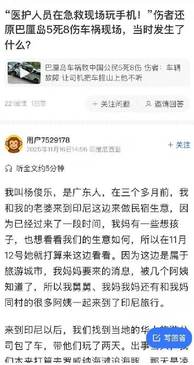 当地时间11月14日凌晨,中国驻印尼登巴萨总领馆接到巴厘岛省警方通报,一辆载有13名中国公民的汽车在巴厘岛北部布勒伦县发生交通事故,造成5人死亡、8人受伤。另一名印尼司机受轻伤。 11月16日,车祸目击者、伤者之一杨先生通过媒体平台发声,用自己的经历重构了车祸现场。扬子晚报/紫牛新闻记者从杨先生处获悉,事发当天,他原本打算去罗威那海滩追逐海豚,但随即就变成了一场不可挽回的悲剧。目前,驻登巴萨总领馆表示将继续跟踪伤者救治情况,并尽全力处理后续遇难者。但车辆故障、救援过程中出现纠纷、失联等问题却频频发生。肇事司机让遇难者和伤者家属陷入深深的痛苦和无助。杨先生就媒体平台热点问题发表的声明。事故现场5人死亡、8人受伤!巴厘岛凌晨发生车祸,造成中国公民伤亡。当地时间11月14日凌晨,载有13名中国公民的小巴沿着登巴萨前往新加拉惹方向行驶。据悉,事发路段位于巴厘岛北部布勒伦县。该地区是当地公认的危险地区,事故率高,并以路况复杂、下坡陡峭和弯道而闻名。据当地警方通报,车辆失控坠毁并继续滚动。事故造成5名中国公民死亡、8人受伤。受害者年龄在60岁左右。八人受伤,其中包括杨先生等人均在当地医院接受治疗,其中部分伤势较重。事故发生后,司机受轻伤,已在现场被拘留。此次事故造成5名中国公民死亡、8人受伤。杨先生和妻子三个月前从广东来到巴厘岛经营民宿。这时,杨先生的母亲特地从中国赶来探望。不少同村亲友和他母亲以前的同事听说此事后,纷纷劝说一起去旅行。他们通过当地一家中国旅游公司包车,顺利旅行了两天。事发当天凌晨2点30分,他们从酒店返回,计划前往罗威那海滩观看海豚,却遭遇意外。事发当天清晨出发出行的杨先生也提醒司机注意休息。作为事故的目击者和受伤人员之一,杨先生回忆起当天的事情。在病床上,他的声音仍然艰难地颤抖着。 “我们是凌晨2点30分从酒店出发的,满心期待能看到海豚,没想到却遭遇了灾难。”前一天,杨先生提醒司机要好好休息,不要提前出发。有时杨先生会提醒司机休息。杨先生说,凌晨5点左右,司机突然要求他检查车上的指示灯。 “我一看,发动机故障灯和刹车故障灯都亮了,车子运行状态很差。”有了以往的经验,杨先生立刻意识到了危险。他立即向司机建议:“当时车速只有40到50英里每小时,我让他把车撞到山上才能停下来。”不过,司机并没有采纳这个建议,继续沿着斜坡行驶。 “速度越来越快,我无法控制,最后直接撞到了悬崖上。”是什么让杨先生更更让人费解的是,汽车撞击的方向,正好在他所在的一侧。 “他本人没有受伤,但我们所有人都没有幸存。”撞击的瞬间,车内一片混乱。 “一个阿姨直飞过去,我妈也飞了半个车,我喊他快点起来。”杨先生回忆,当时他的脚被车紧紧夹住,手被粉碎性骨折。 “当时我唯一能动的就是一只脚,我一直踢着玻璃盖,希望孩子和亲人能够逃走。”他看着身边的亲人一一倒下,却什么也没做。 “我永远不会忘记我一生中那种无助的感觉。我以为我活不下去了。”杨先生一直在车上,直到听到孩子的哭声。直到这时,他才重新有了活下去的意志。 “我的双腿沾满了血,疼痛难忍,但我还是用力拉着,最后踢开了玻璃,爬了过去。”他说事故发生后事发后,他和司机一起将前挡风玻璃砸碎,但司机却没有顾及救人,直接离开了现场。杨先生还提到,与他同行的13人包括他的母亲、妻子、儿子,以及母亲的同村亲戚、朋友和老同事。被杀的两名阿姨是他母亲的表兄弟,另外三名受害者也是他母亲的前同事。 “其中一名受害者当场死亡,我是军人,我知道如何判断。进入他的人都没有任何反应,脸色都变得苍白。”许多其他受害者在获救时也出现了生命迹象。 “还有一些人呼救,当叫到他们的名字时,他们仍然回应。继续,他们在寻求帮助。”花了15个小时才得到有效治疗。事故发生后,车队老板也失去了救援过程和后续治疗的联系,这让杨先生更加心寒。他们等了15事故发生后数小时内被送往市医院进行有效救治。 “报警后,一个多小时,摩托车才到,这里有一个警察,看了一眼就离开了。”杨先生说,又过了20分钟,警车才赶到。从事故现场到医院有20多分钟的车程,但救护车却花了两个小时才到达。更让他难以接受的是,随后的营救方式极其粗暴。 “当时车上有两位阿姨,他们没有拆解、切割,而是直接用吊车把车吊起来。这种行为直接给两位阿姨造成了二次伤害,最后双双身亡。”杨先生和他的母亲被送进了同一辆救护车。 “我母亲浑身流血,但没有急救人员为她止血。”到达医院后,等待的却是“医生”的答复。不在这里。”“当时很多人都受了重伤,但医院无法给我们止血,也无法包扎。我的手只用一根皮带和两根树枝固定。”在接下来的4个多小时里,事故救援现场,伤者被一一送往医院。“直到下午4点,伤者才被送往医院。” “我们做了X光检查。”杨先生说,他们强烈要求转往市医院,但当地医院没有同意。“我们花了15个小时才达成共识。事故发生在凌晨5点左右,我们早上8点就到了医院,直到晚上9点才到达医院。我们转移到一家大城市医院开始救援。十几个小时都没有得到有效的治疗。让家人更加受伤、受伤的,是医院为杨先生母亲做手术花费的17万元护理费。 “我母亲现在还躺在重症