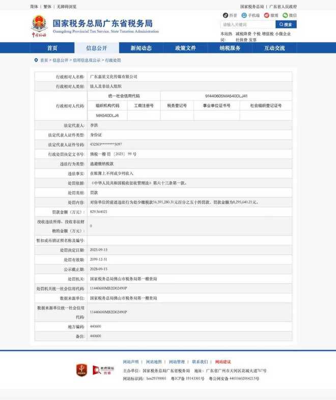 原定12月11日中午12点由网红“周周真爱625”直播的直播并未如期推出。日前,拥有千万粉丝的网红“周周真爱625”名下的控股公司涉嫌逃税逾1600万元。今年9月,国家税务总局佛山市税务局第一检查局发现其存在违法行为。该公司被处以罚款8,295,640.21元。此事件引起社会关注。网红“周周真爱625”名下的控股公司因涉嫌逃税1600万元以上被行政处罚。图片来源:国家税务总局、广东省税务局官方网站。 12月11日,该报注意到,网红“周周真爱625”在快手平台发帖称将开始直播决赛11日中午12:00《双十二》决战。目前,因前述逃税事件,可能无法按时播出。截至发稿,网红“舟舟真可爱625”已删除上线信息。 “周周真可爱625”快手账号原本计划今天中午直播,但没有正常开始直播,直播信息被删除。网红“周周真可爱625”已在电商平台验证为“周真”。视频内容主要分享美容、护肤。抖音、快手、小红书粉丝数分别为584.9万、5044万、2.7万。他在快手平台的个人资料显示,他是健力士保湿精华液的畅销品,也是快手平台全民补品的合作伙伴。澎湃新闻注意到,网红“周周真爱625”开设的快手店营业执照信息为快手平台上的名称为“广东嘉兴投资集团有限公司”。天眼查透露,周震为广东嘉兴投资集团有限公司实际控制人,持有99%股份并担任董事。本次涉嫌逃税被立案调查的公司为广东嘉兴文化传媒有限公司,该公司为广东嘉兴投资集团有限公司全资子公司,涉及其账簿未列示、少列收入的违法事实。国家税务总局佛山市税务局第一稽查局行政处罚:“贵单位有前述违法行为,对你单位少缴税款的50%承担责任。” 16,591,280.31元,罚款金额8,295,640.21元。”处罚日期为2025年9月15日。文件指出,一年前,广东嘉兴投资集团有限公司天眼查透露,2024年10月23日,广东嘉兴投资集团有限公司佛山市南海区税务局大沥税务分局因拖欠城镇土地使用税39,292.63元,将佛山市南海区大沥税务分局列入欠税名单; 2025年7月4日,因未在《企业信息公开暂行规定》第八条规定的期限内披露年度报告,被佛山市南海区市场监督管理局列入经营异常名录。